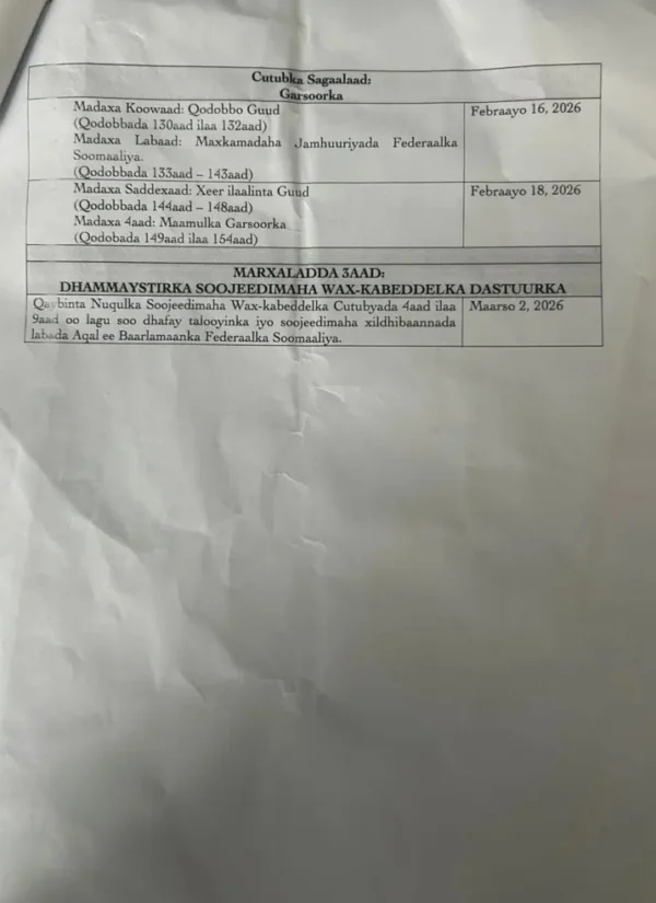 Jadwalka ayaa ka koobnaa sadex marxaladood oo kala dambeeya, sida ku cad nuqun ay BBC-du heshay, marxaladda kowaad ayaa loogu talo galay in lagu qeybiyo nuqullada ay ku qoran yihiin ‘soo jeedinta wax ka beddelka dastuurla’, halka marxaladda 2aad ay noqonayso ‘ka doodista wax ka beddelka dastuurka’, iyo marxaladda u dambeysa oo ah ‘dhammeystirka soo jeedinta wax ka beddelka dastuurka’.